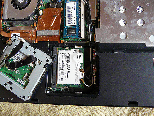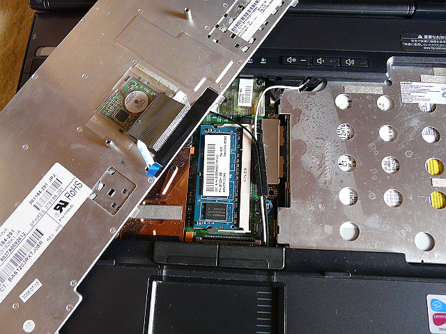 写真中央部左、キーボード右にメモリーが取り付けられていることを確認できます。