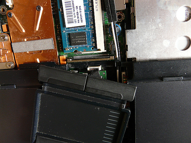 キーボードを少し浮かすと、タッチパッド付近にキーボードケーブルとトラックポイントのケーブルが見つかります。