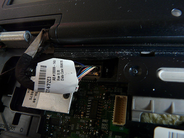 ※写真では指の左がキーボードケーブル、指の下方がケーブルのコネクタ、指で触っている青いシールがトラックポイントのケーブルとコネクタです。
