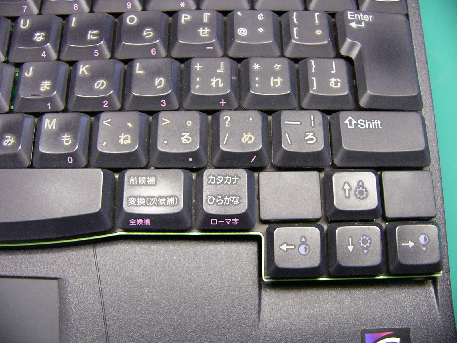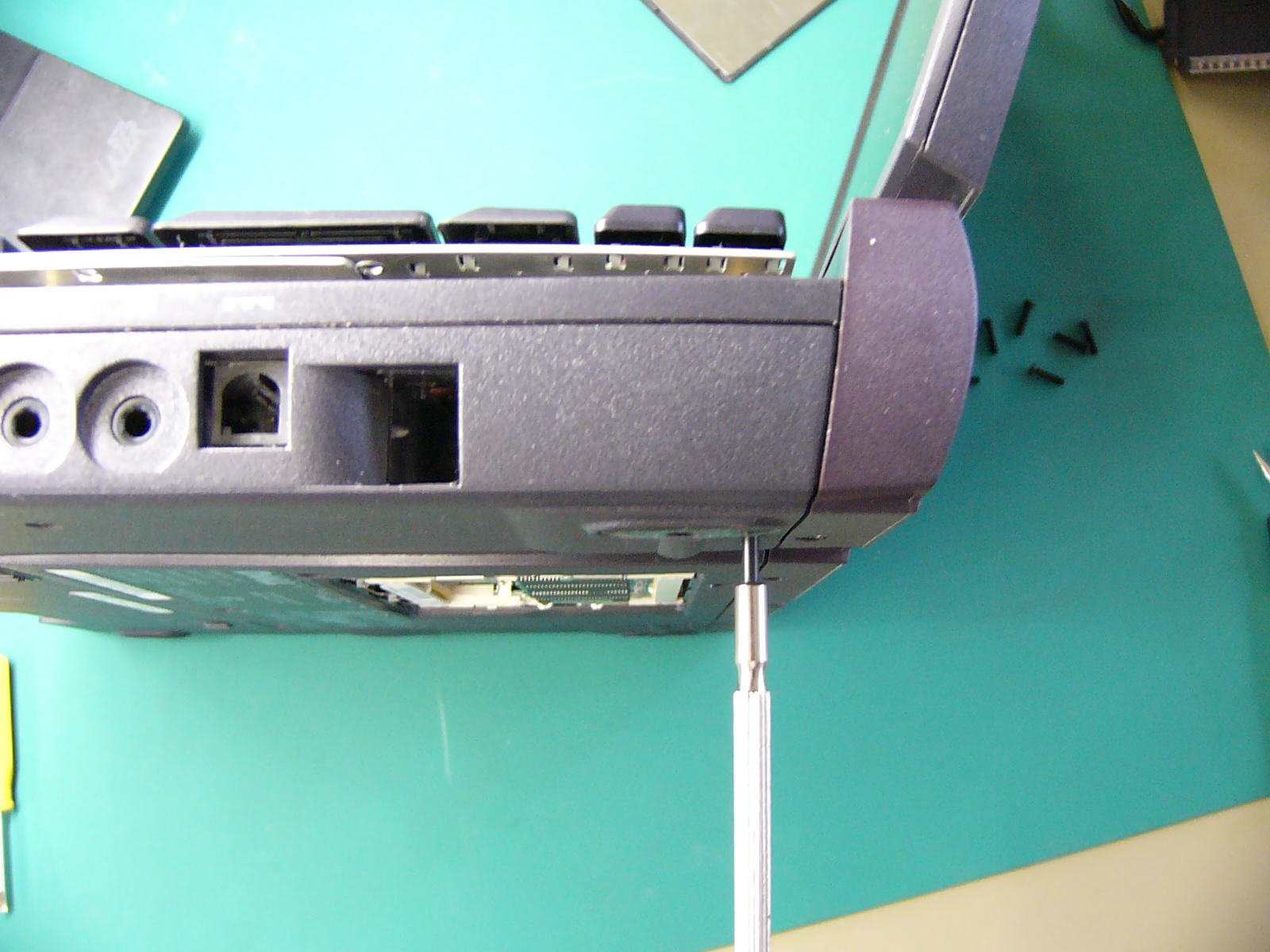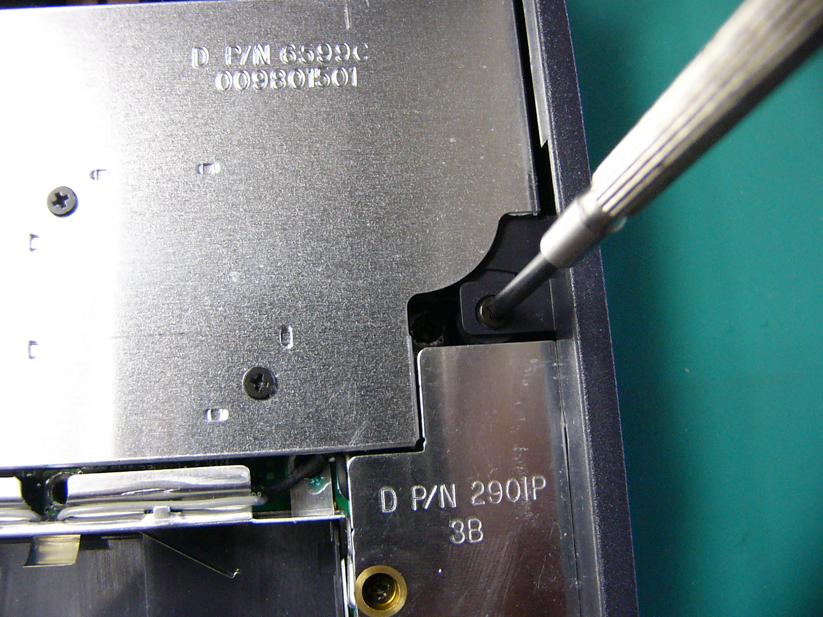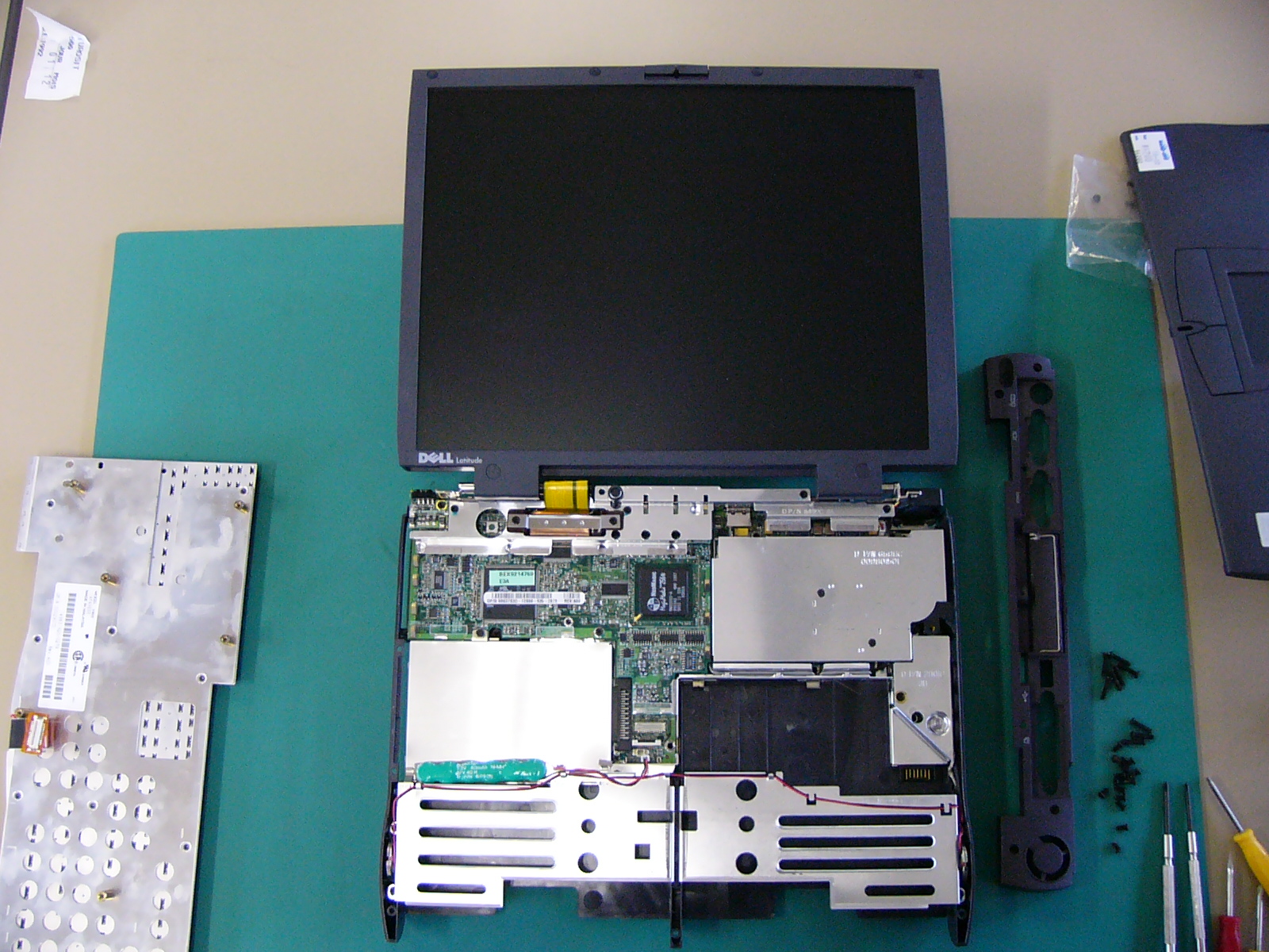 まず、正面からの 全体像です。右側に積んであるのは 上から「バッテリー」 「CD−ROM」 「FLOPPY」です。 「起動画面」 電源オン時のパワーオン セルフ(POS)テストの 画面です。 この時点で、「F2」キーを 押しても、パスワード入力 画面に進みます。 BIOSパスワードの入力 画面この画面状態のままパス ワードを入力します。 (キー入力で、画面が変化 することもありません。) パスワードが違っていると エラーになります。 (3回間違えると 電源が切れます。) 悲しい画像だ!(;_;)泣 裏面のメモリスロットと フラッシュ(FLASH)メモリ です。 (メモリスロット横の黒い 四角いICチップがBIOS を格納しているフラッシュ メモリです。) 裏面全体の画像です。 ここから、見えるねじを すべて外します。 (長さの違う3種類のねじ がありますが、長いもの がキーボードの固定用 です。) キーボードの固定ツメ(1) (このツメを最初に 外します。) キーボードの固定ねじを 外した穴から細い ドライバーを差し込み、 キーボード右側を浮かせ ます。 右側手前にあるツメを 外してキーボードの右側 を浮かせたところ。 キーボードの固定ツメ(2) (このツメは、外す必要は ありません。 キーボード右側を浮かせ た後、ずらして外します。) 無理に外そうとすると、枠を 破損します。 キーボードの固定ツメ(3) (このツメもキーボード右側 を浮かせて外します。) キーボードの取り付け時は 左側から押し込むような感じで 取り付けます。 左側手前にあるツメを 外してキーボードを浮 かせたところ。 (キーボードが、なかなか 外れなかったので、 ドライバーでツメを 外してみました。) キーボード接続用の フレキシブルケーブル を外します。 普通に外せますが、場所 が狭く、コネクタも小さい ので慎重な作業が必要 です。 キーボードのフレキシブル ケーブルを外したところ。 この時点で、フラットパネル 用の黒いケーブルも外して おきます。 こちらは、コネクターの ストッパーが外れれば、 簡単に取れました。 キーボードの外枠 (パームレスト)を 外すため、隠しねじを 1本、外します。 (最初は、これが判らな かったため、外枠を壊 しそうになりました。) 外枠(パームレスト)の 取り外しには、HDD ケースの固定ねじと ケース下のねじも外さ なければなりません。 さらに、本体背面の I/Oパネルカバーを 取り外すため、ねじを すべて取り外します。 (結局、全部のねじを 外します。) キーボードおよび 背面のI/Oパネル カバーを外したところ いよいよ 外枠(パームレスト)が 外れます。 外枠を外したところ 外枠(パームレスト)が 外れて、システムクロック のバックアップ電池が 見えました。 この線を外せば、今回の 分解目的は達成です。