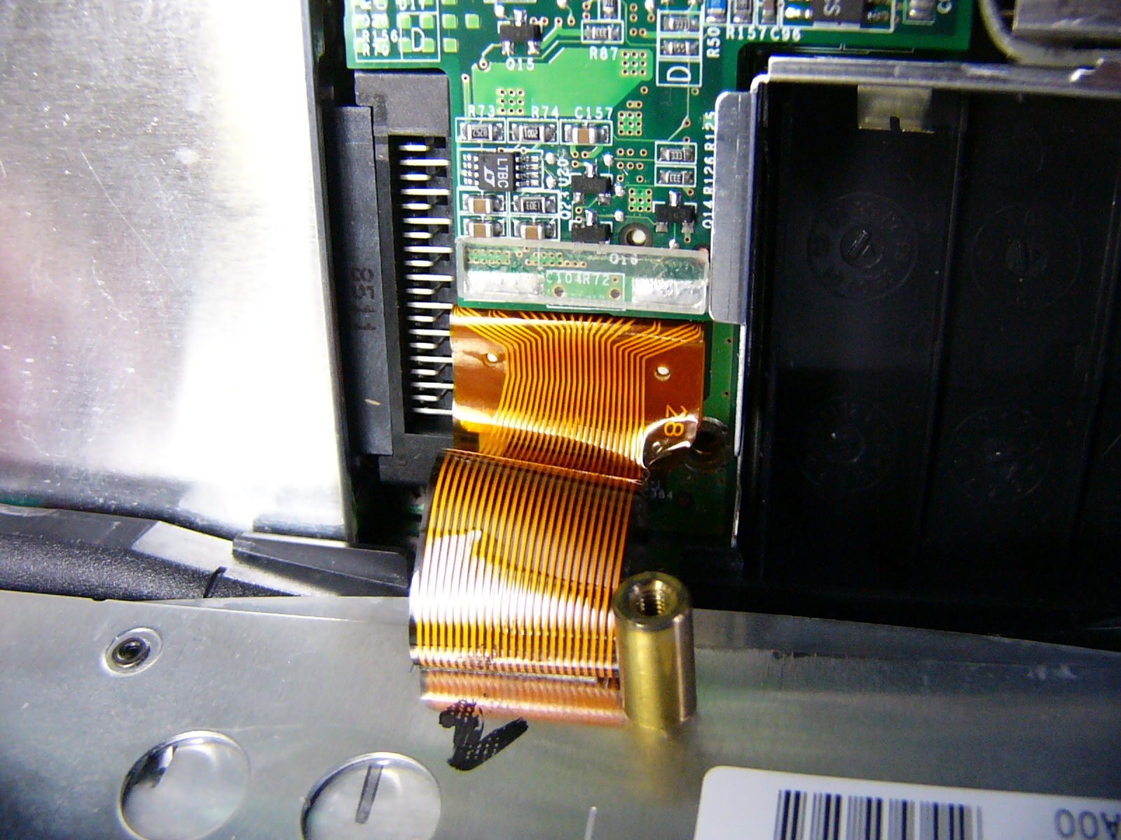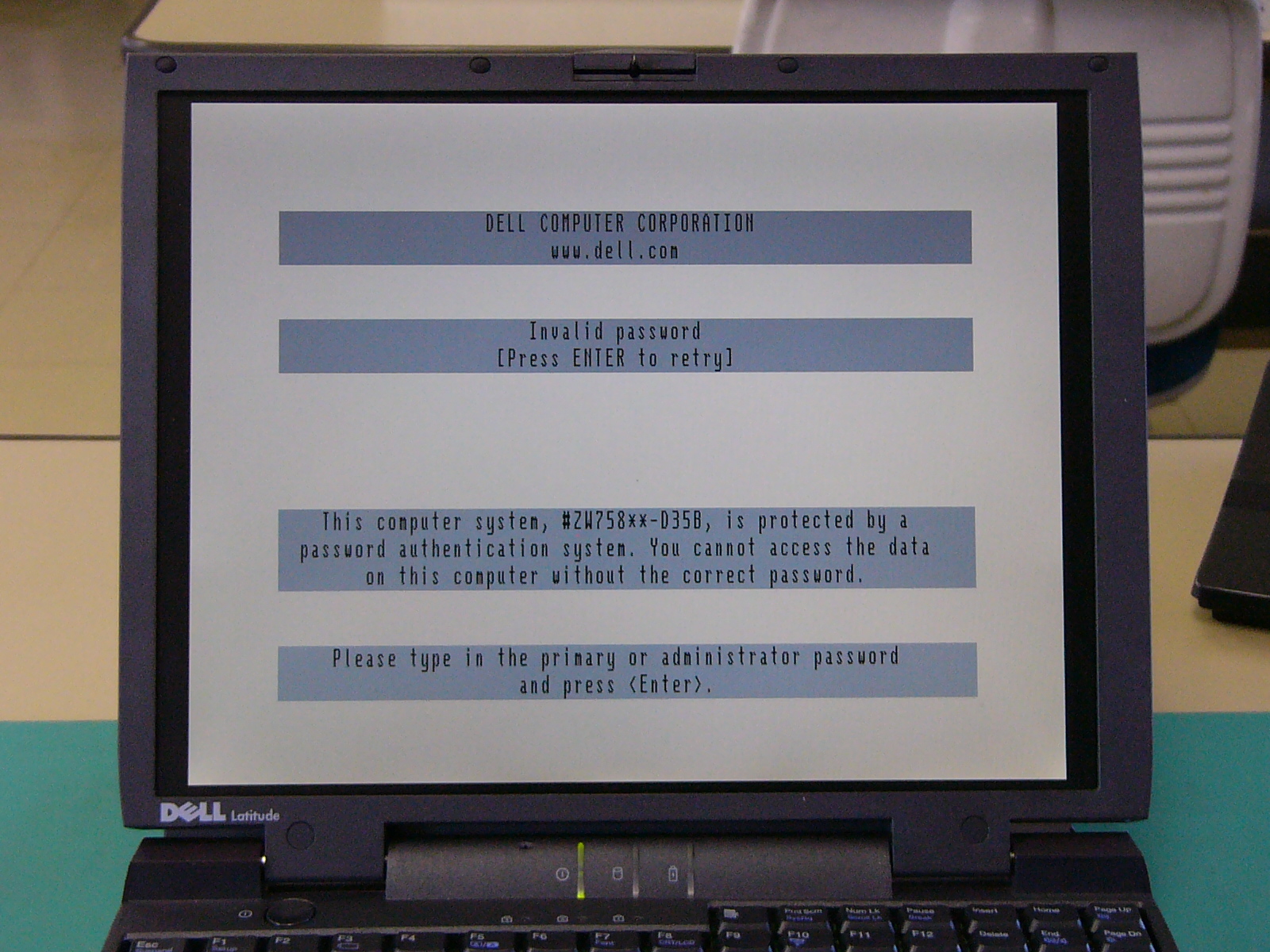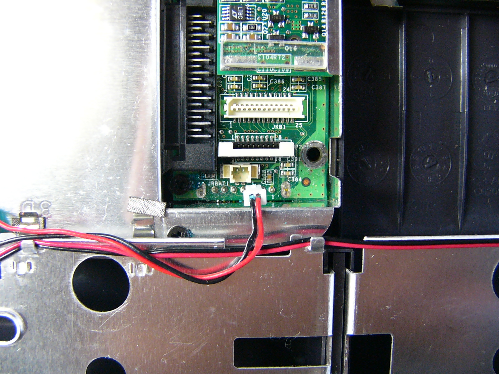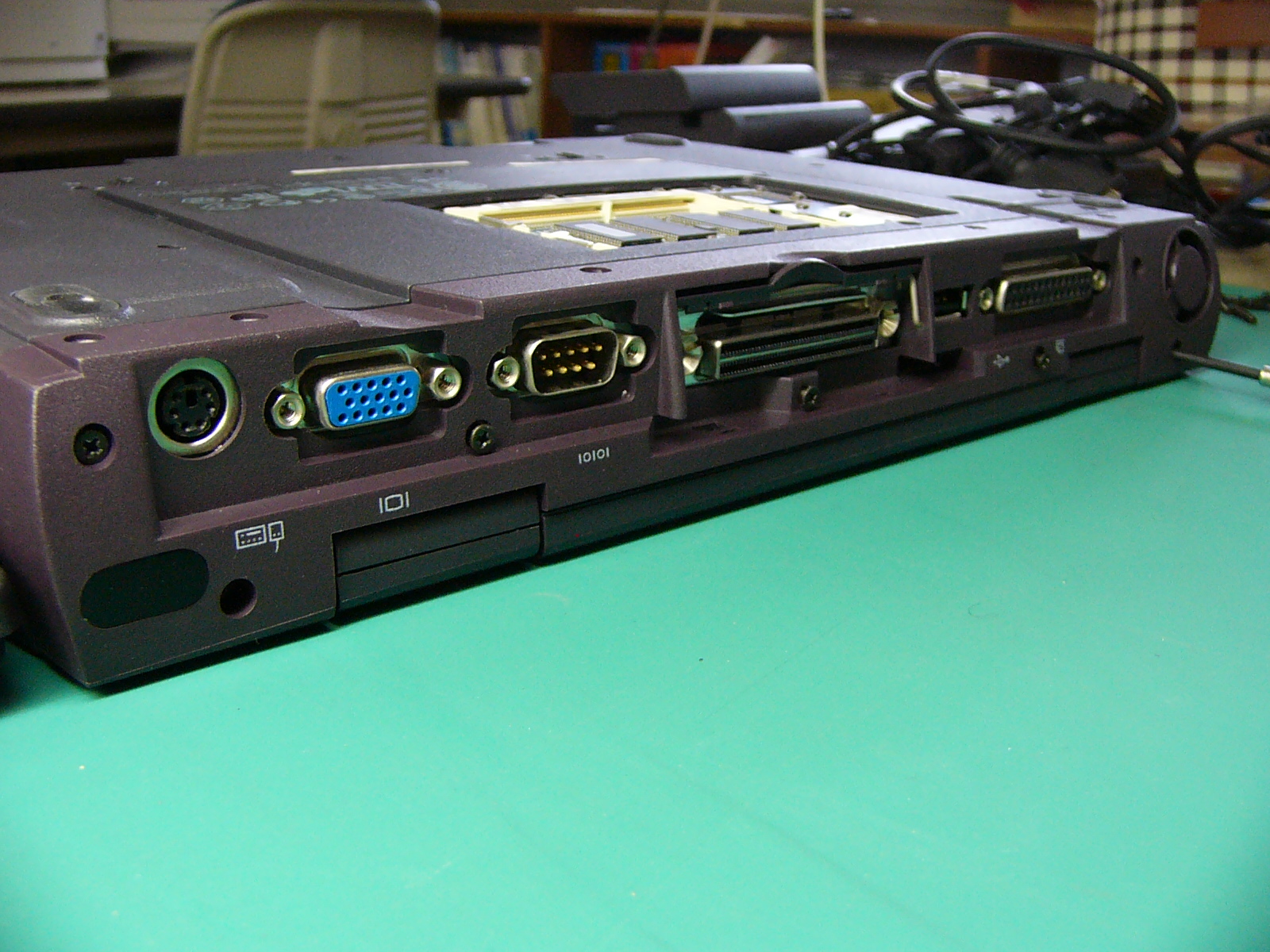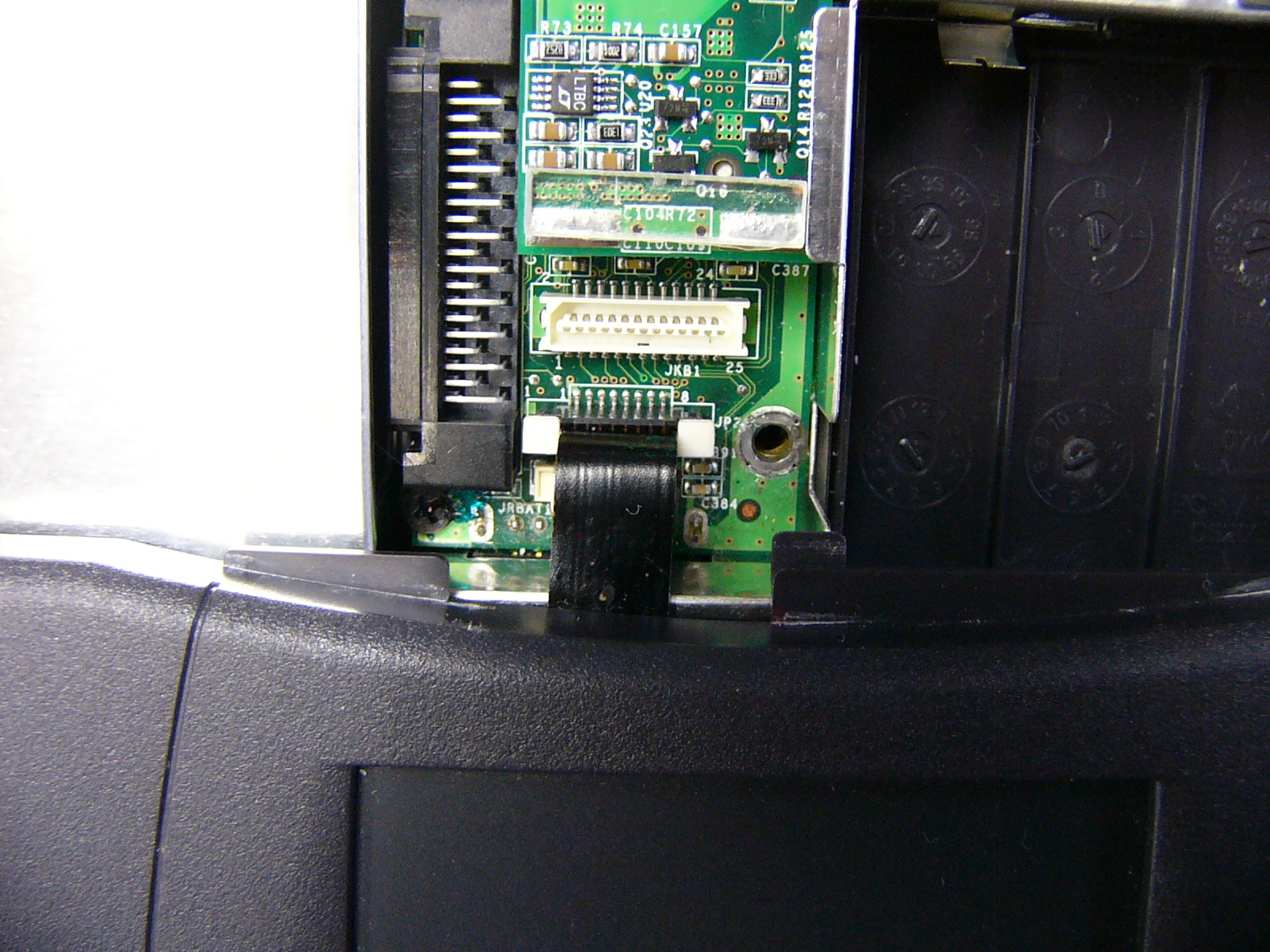 まず、正面からの 全体像です。右側に積んであるのは 上から「バッテリー」 「CD−ROM」 「FLOPPY」です。 「起動画面」 電源オン時のパワーオン セルフ(POS)テストの 画面です。 この時点で、「F2」キーを 押しても、パスワード入力 画面に進みます。 BIOSパスワードの入力 画面この画面状態のままパス ワードを入力します。 (キー入力で、画面が変化 することもありません。) パスワードが違っていると エラーになります。 (3回間違えると 電源が切れます。) 悲しい画像だ!(;_;)泣 裏面のメモリスロットと フラッシュ(FLASH)メモリ です。 (メモリスロット横の黒い 四角いICチップがBIOS を格納しているフラッシュ メモリです。) 裏面全体の画像です。 ここから、見えるねじを すべて外します。 (長さの違う3種類のねじ がありますが、長いもの がキーボードの固定用 です。) キーボードの固定ツメ(1) (このツメを最初に 外します。) キーボードの固定ねじを 外した穴から細い ドライバーを差し込み、 キーボード右側を浮かせ ます。 右側手前にあるツメを 外してキーボードの右側 を浮かせたところ。 キーボードの固定ツメ(2) (このツメは、外す必要は ありません。 キーボード右側を浮かせ た後、ずらして外します。) 無理に外そうとすると、枠を 破損します。 キーボードの固定ツメ(3) (このツメもキーボード右側 を浮かせて外します。) キーボードの取り付け時は 左側から押し込むような感じで 取り付けます。 左側手前にあるツメを 外してキーボードを浮 かせたところ。 (キーボードが、なかなか 外れなかったので、 ドライバーでツメを 外してみました。) キーボード接続用の フレキシブルケーブル を外します。 普通に外せますが、場所 が狭く、コネクタも小さい ので慎重な作業が必要 です。 キーボードのフレキシブル ケーブルを外したところ。 この時点で、フラットパネル 用の黒いケーブルも外して おきます。 こちらは、コネクターの ストッパーが外れれば、 簡単に取れました。 キーボードの外枠 (パームレスト)を 外すため、隠しねじを 1本、外します。 (最初は、これが判らな かったため、外枠を壊 しそうになりました。) 外枠(パームレスト)の 取り外しには、HDD ケースの固定ねじと ケース下のねじも外さ なければなりません。 さらに、本体背面の I/Oパネルカバーを 取り外すため、ねじを すべて取り外します。 (結局、全部のねじを 外します。) キーボードおよび 背面のI/Oパネル カバーを外したところ いよいよ 外枠(パームレスト)が 外れます。 外枠を外したところ 外枠(パームレスト)が 外れて、システムクロック のバックアップ電池が 見えました。 この線を外せば、今回の 分解目的は達成です。