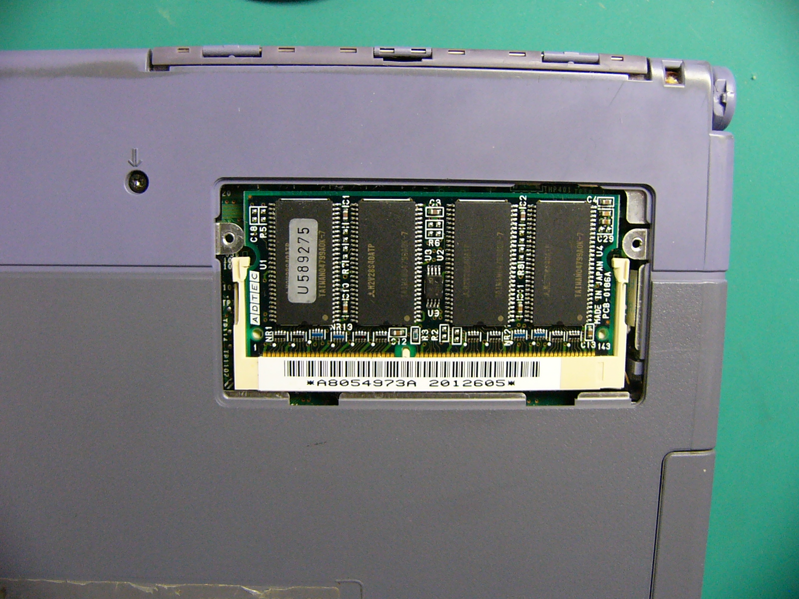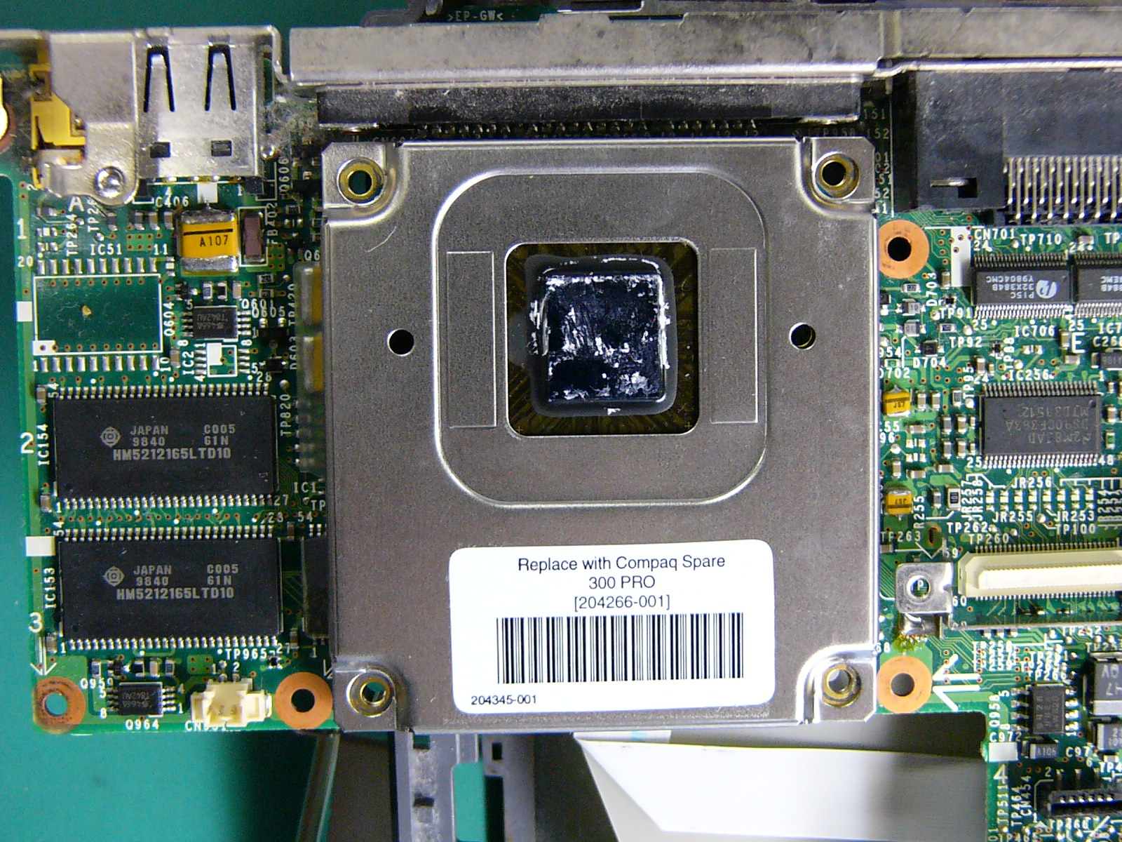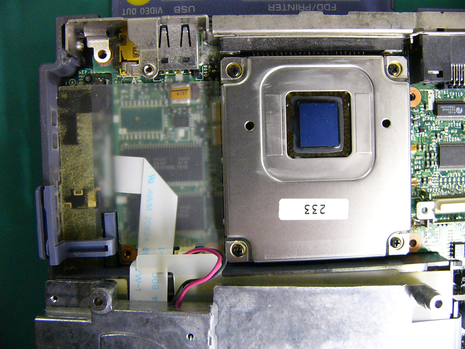交換前の「起動画面」 「BIOS」設定画面です。 (画面左端に緑の輝線が出ています。) 「システム情報」の表示です。 全体像です。 カードスロットに刺さっているのは 「なな、なんと無線LANカード!!!」 ではアーリマせんか? (いまどき、珍しくもないですね。) 裏面の全体像です。 裏面のメモリスロットと メモリ(ADTEC128MB) です。 ADTECのメモリは、 信頼性も高いのですが 高さがあるため物理的 に利用できない機種が 多かったりします。 裏面全体の画像です。 ここから、見えるねじを すべて外します。 (メモリのほかにチップが 1つ見えますが詳細 不明です。BIOS用?) 裏面のネジをすべて外し 終えたらキーボードの上部 にあるフレーム止めのネジ を外し、キーボードごと フレームを少し手前にずらし ます。 電源スイッチ右にあるような 突起でフレームを固定して ありますので、プラスチックの フレームに無理な力を加えて 外そうとすると破損します。 フレームが外れたところです。まだ、タッチパッドのケーブル が外れていないので無理に 動かしてはいけません。 キーボードのコネクタを2本 外すとキーボードが取れます。 キーボードを取り外してから フレームについているタッチ パッドのケーブルをコネクタ から抜き取ります。 キーボード側のフレームが 取り外せたら、左上部に ファンの付いた金属性の 放熱板(というよりブロック) が見えます。 この下にCPUが隠れてい ます。 ここからは、液晶ディスプレイ を外していきます。 液晶ディスプレイは、ヒンジと 呼ばれる部品で支えられて いるので、ヒンジを固定して いるネジを外します。 ヒンジに組み合わさっている シールド用のアルミ板を 止めているネジ(中央付近 の2本)を外します。 左右両サイドのヒンジ固定 ネジを外し、フレーム上部 左右の止めネジを外すと、 ヒンジを上に引き上げる ことができるようになります。 (ディスプレイのケーブルを 外すまで、引き抜いては いけません。) シールド板を変形させない ように慎重に、丁寧に取り 外します。 シールド板の下にある茶色 のディスプレイケーブルの ネジを外して取り外します。 もう1つ白帯と青帯の入った LED用のケーブルも外します。 本体からディスプレイを 抜き取ると、左上にCPU のクーラーファンとヒート シンクが出てきます。CPUクーラーは3本のネジで 固定された状態です。 CPUファンを外したところ。 これがミニカートリッジです。 CPUのコア部分には熱伝導 ゴムが張り付いていますが 破れないように丁寧にはがして 保管しておきます。 (CPUは、ボルト・ナット止めに なっているため、マザーボード を取り出さなければ交換でき ません。) マザーボード右上隅のネジ とカードスロットの止めネジ およびマザーボード中央部分 の2本のネジ、さらにCPU 左下の止めネジの脇にある マザーボード固定ネジを 外します。 すいません この部分の画像は、 撮っていません。 マザーボードを取り出して 裏面を見ると、メモリスロット 付近に、CPUを止めている ボルト・ナットを確認できます。 ナットを取ってボルトを外すと CPUを取ることができます。 ※ボルトは、ぐらつきを抑える ためか、金属製の支柱に 通してあります。 CPUを外すときも無理に はがすとピンを傷めてしまう ので平均的に少しずつ外し ていきます。 左が元々ついていた233MHz 右が換装用の300MHzです。 「Compaq」のシールが泣かせ ます。 CUPを取り付けるために ボルトの支柱を配置します。あまり神経質になる必要も ありませんが、多少丁寧に 作業しましょう。 CPUをセットするのですが、 ここも慎重に力を加えて いきます。 (無理やり押し込んで支柱が ずれたりするとCPUのコネ クタやピンが破損します。) うまくセットできたら、ボルトと ナットで固定します。 CPU交換が終了したら、今回の 分解目的は達成です。 熱伝導ゴムをCPUコアに貼り付け 分解の逆手順で本体を組み立てます。 ※この時点で、ネジ止めは最小限に とどめておき、起動・動作確認後に 再度組みなおしを行います。 (交換失敗や接続ミスのチェック およびあわてて組み立てること による組み付けミスを防止する ためです。) これが、起動時の画面です。 (BIOSのバックアップ電池も 外したので、内蔵時計が 狂っており、システム設定 をやり直すことになります。) 画面左の緑の輝線は直って いません。(残念:コネクタの 接触不良ではないようだ!)