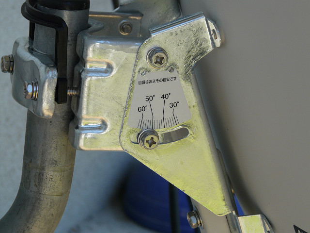アンテナの方向調節は、居住地の緯度(北緯)に合わせて上下角をおおまかに調節して固定しておきます。横方向の角度は機械の接続が終わってから、チューナー画面の信号強度を見ながら少しずつ動かして調整することにします。