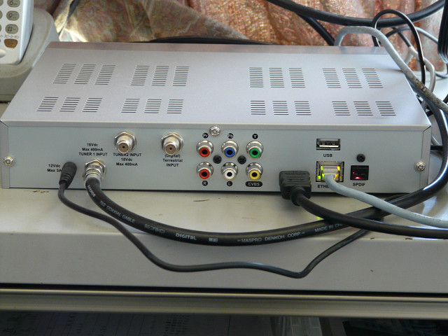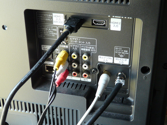 背面の写真です。向かって右からUSBメモリーの差込み口とLANケーブルのコネクタ、中央部にBS入力用のコネクタ、その左が地デジ入力用のコネクタ、さらに左がCS(スカパーなど)入力用のコネクタで、左端には電源アダプタが接続されています。