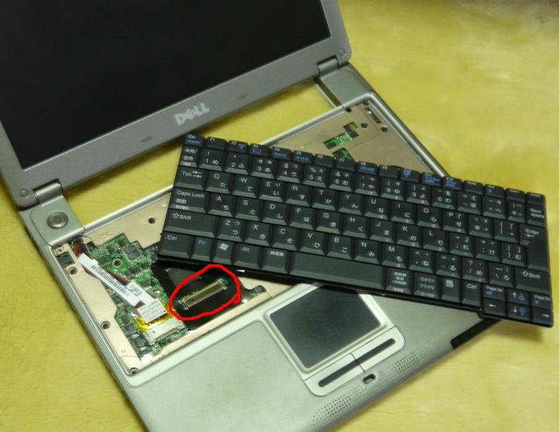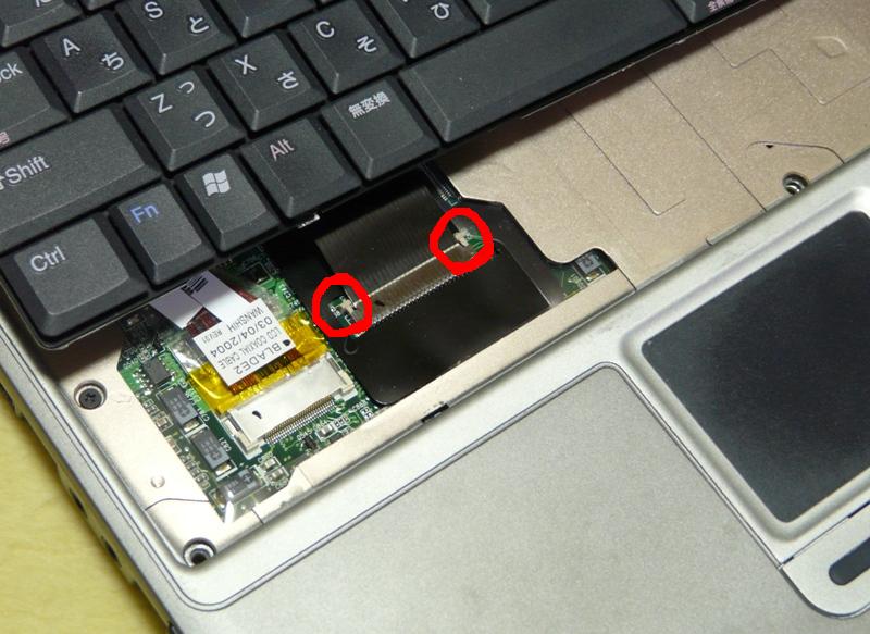 この画像で、キーボードケーブルのコネクター部の止め具の様子を参照ください。