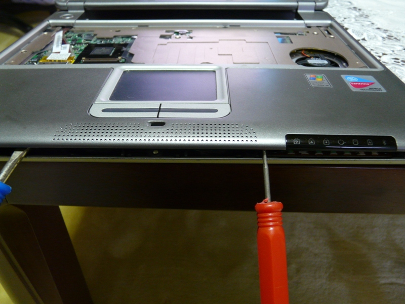 9.パームレストの手前は噛み合いになっているので、爪か細いマイナスドライバーを差し込んで外します。